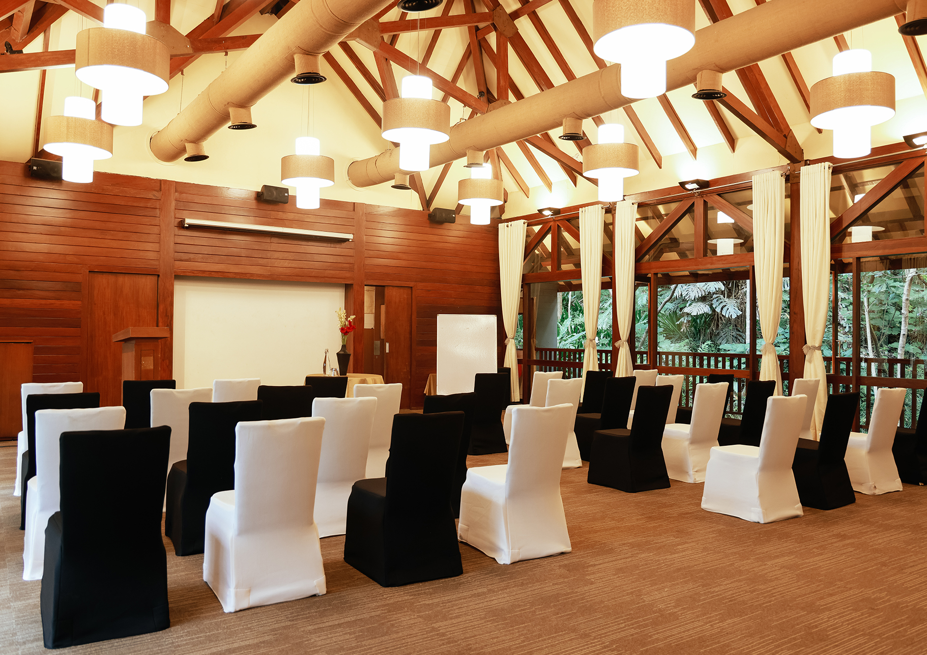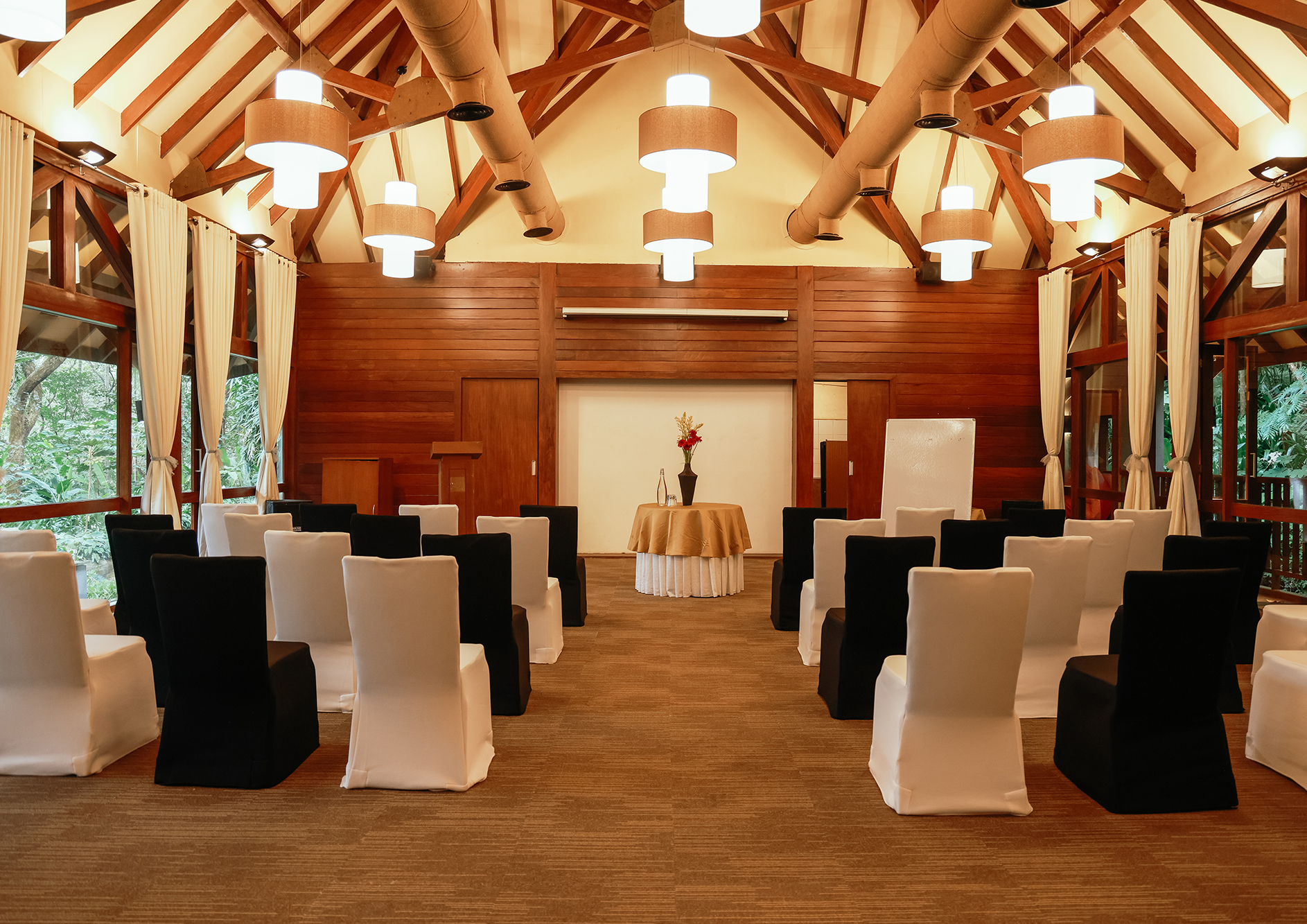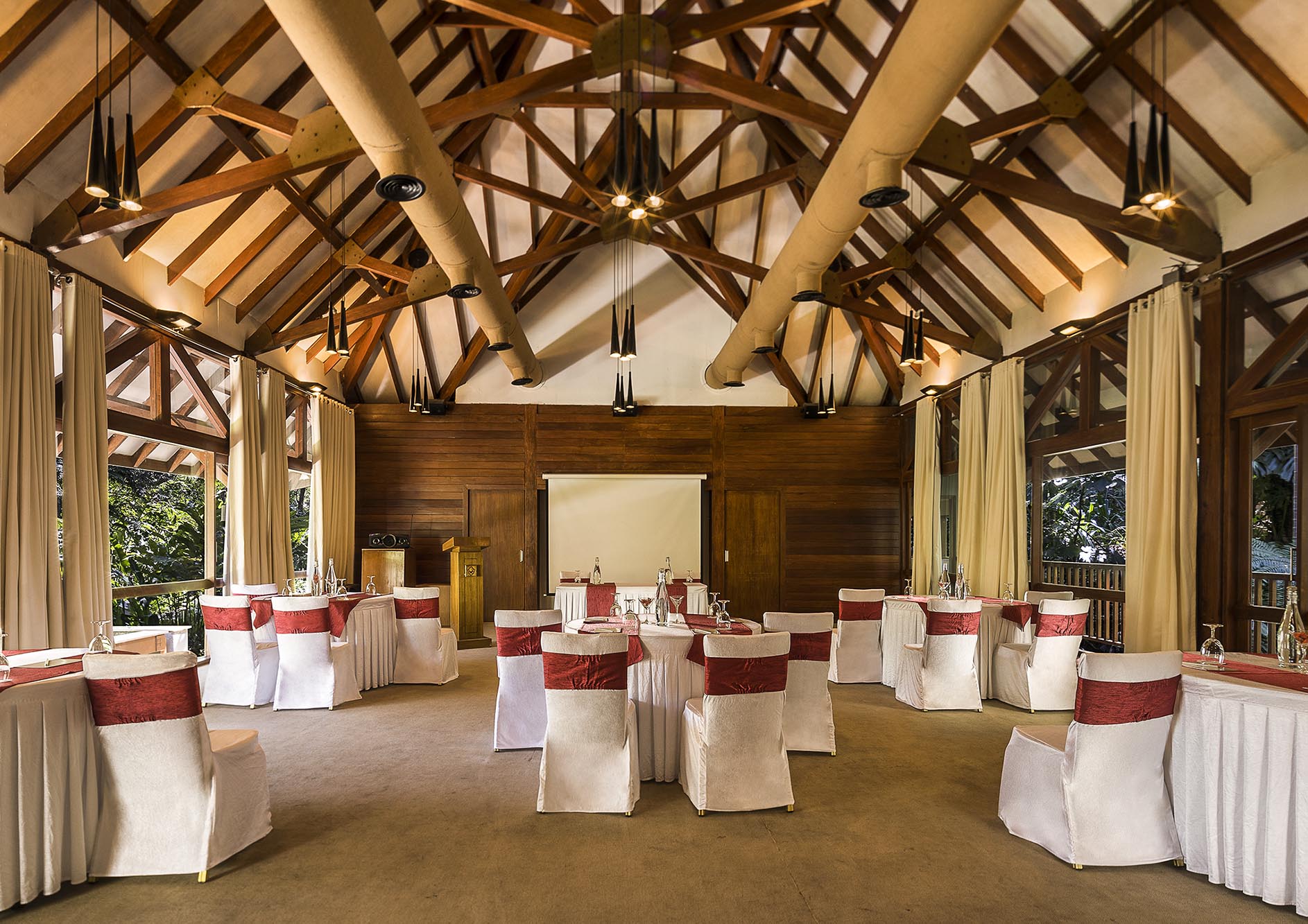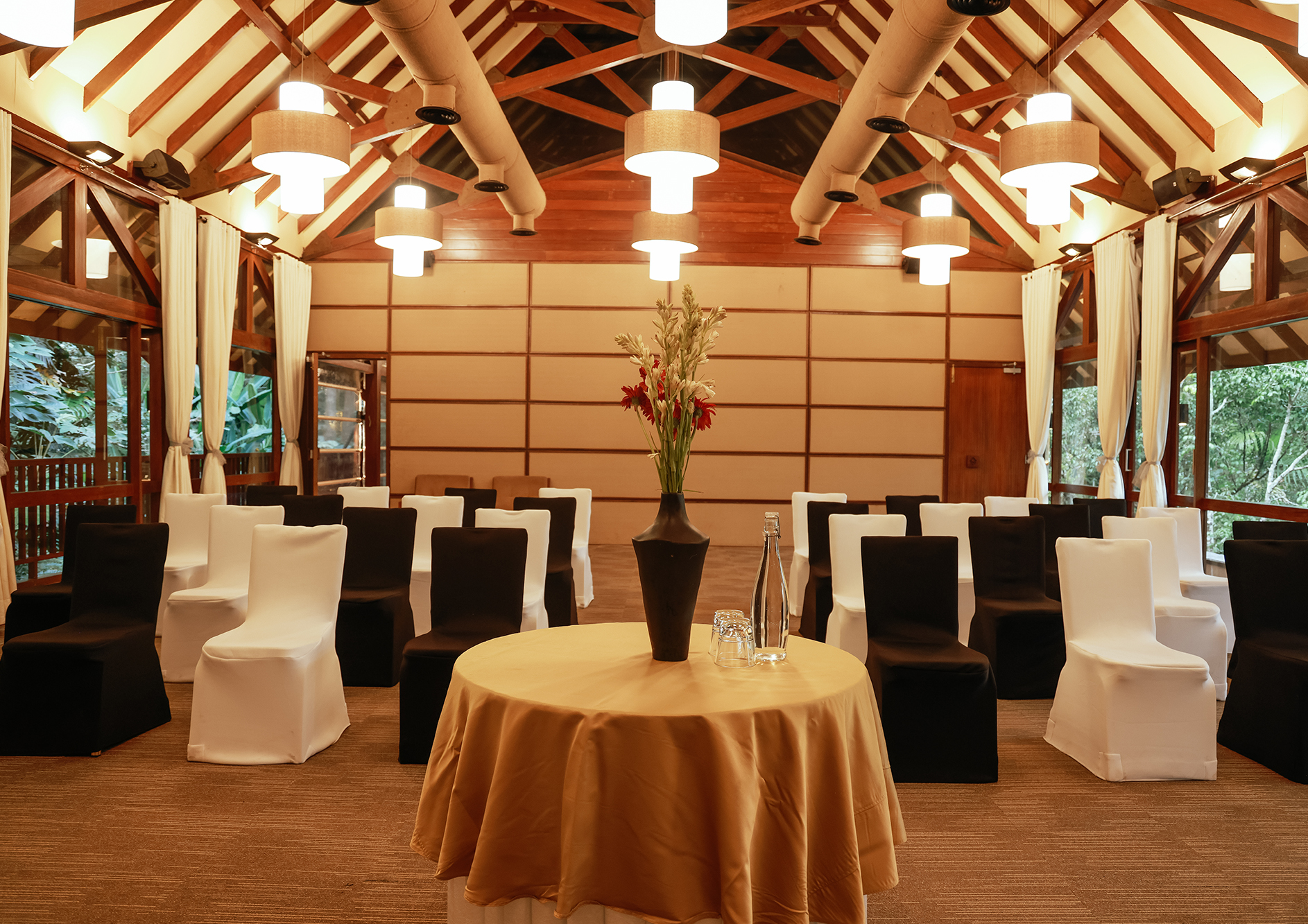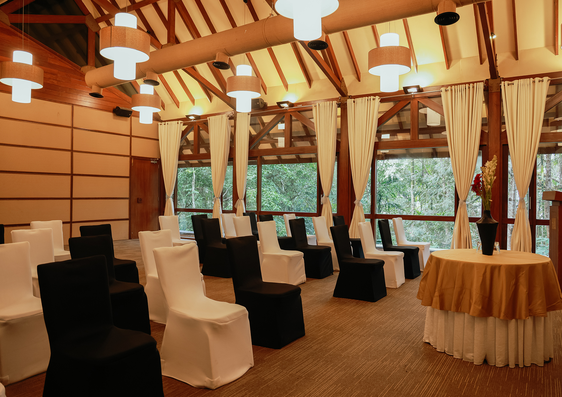 Erected over a valley with a three-tiered waterfall at one end and a stream flowing below, the Business Retreat facility has glass walls on either side that provide unhindered views of the scenic outdoors. A technical marvel akin to The Falls, its unique setting adds an interesting vibe to brainstorming and breakout sessions, conferences etc.